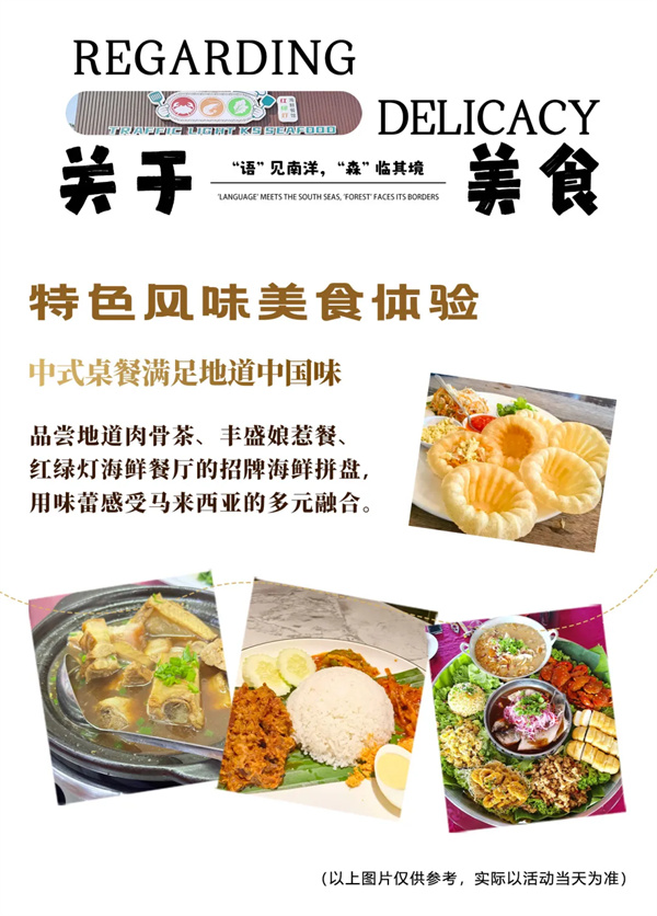 2.用餐:全程4早8正餐,社会餐厅餐标100元/人,包含2顿学校内简餐,3顿中式围桌,1顿娘惹餐,1顿肉骨茶,1顿海鲜餐)
