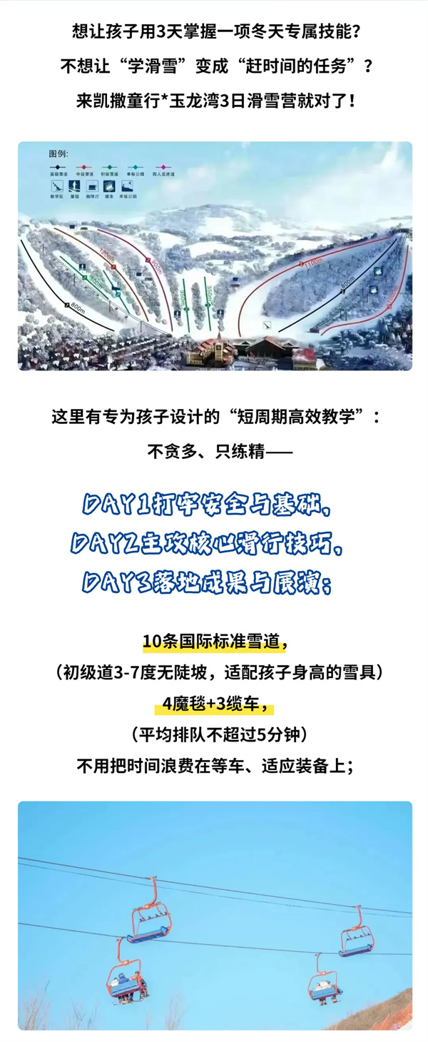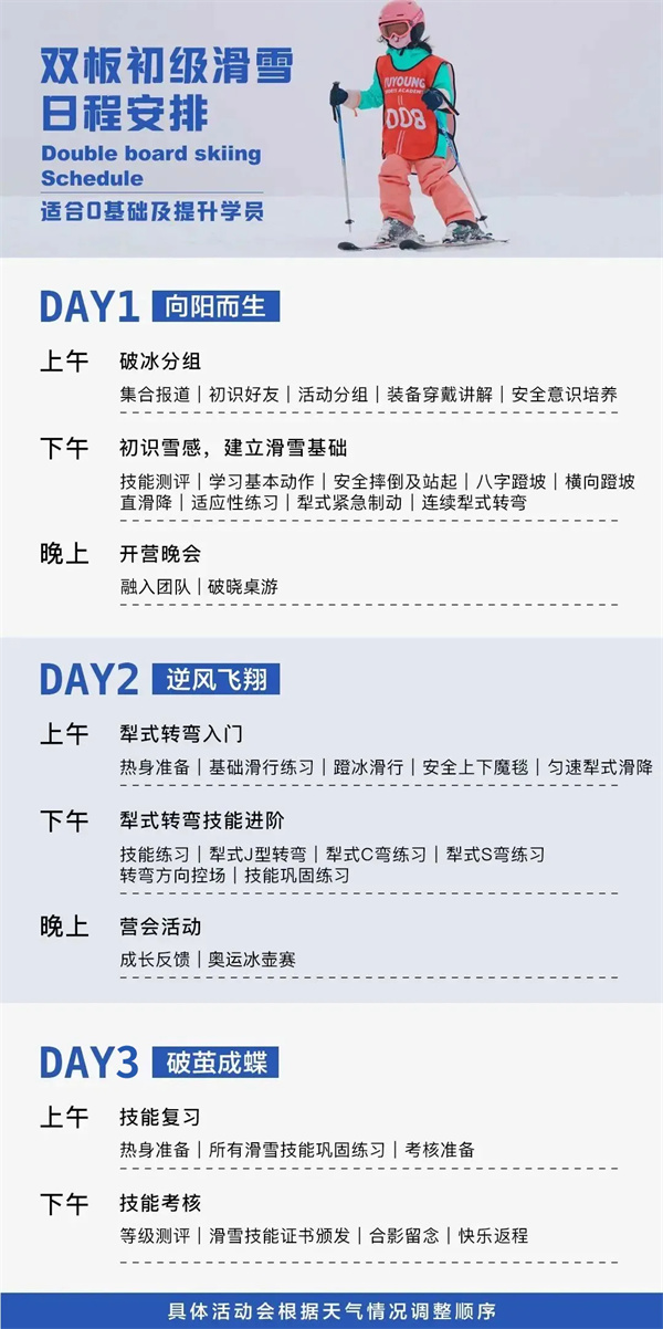 包含“滑雪技能证书”、“滑行视频”、孩子写的“滑雪日记”,把3天的成长“实物化”带回家。