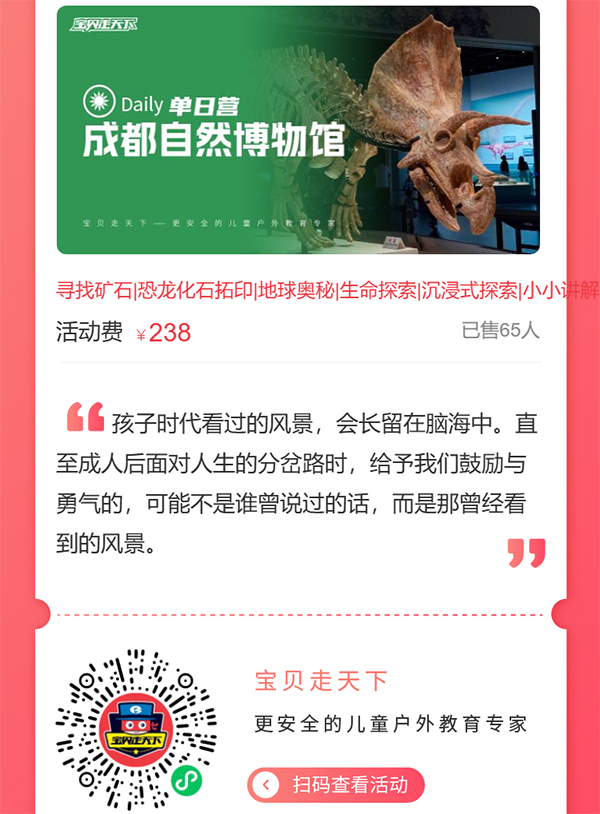宝贝走天下,国内首家通过ISO9001“国内儿童研学旅行”认证的儿童户外活动机构,截至今日已覆盖全国20+城市。专注打造高品质儿童户外活动,践行儿童户外成长教育。目前公司已发展成国内儿童户外教育标志性企业。获得包括著名天使投资人王刚、暾澜资本、上市公司皇氏集团、华盖资本、丰厚资本等机构从天使轮到B轮的融资。公司核心团队成员多来自阿里巴巴、中国美院、新东方等互联网企业与教育机构,汇聚资深户外活动玩家与儿童教育专家。公司总部在杭州,下设北京、上海、广州、深圳、南京、济南、西安、成都、厦门、福州、武汉、长沙、苏州、宁波等20+城市分部。