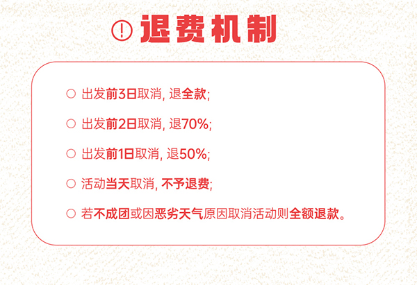 出发前3日取消或换期,退全款:出发前2日取消或换期,退70%,扣30%;出发前1日取消或换期,退50%,扣50%;出发当日取消或换期,不予退费: