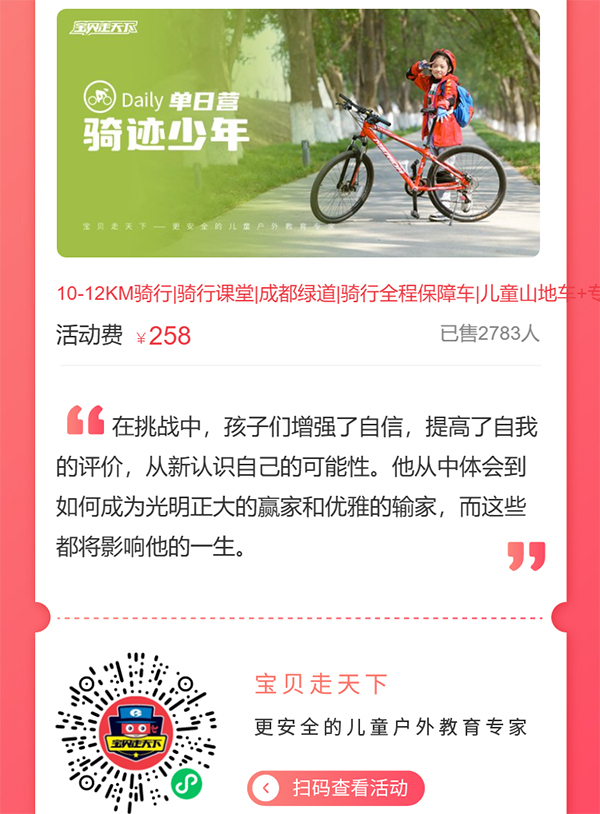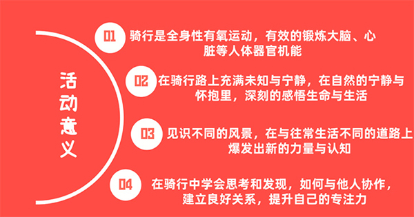 安全:全程80%林荫绿道、专业自行车、专属车牌骑行前专业技能培训+考核,让户外骑行更安全