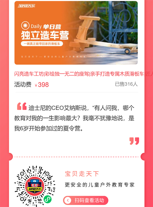 宝贝走天下,国内首家通过ISO9001“国内儿童研学旅行”认证的儿童户外活动机构,截至今日已覆盖全国20+城市。专注打造高品质儿童户外活动,践行儿童户外成长教育。目前公司已发展成国内儿童户外教育标志性企业。获得包括著名天使投资人王刚、暾澜资本、上市公司皇氏集团、华盖资本、丰厚资本等机构从天使轮到B轮的融资。公司核心团队成员多来自阿里巴巴、中国美院、新东方等互联网企业与教育机构,汇聚资深户外活动玩家与儿童教育专家。公司总部在杭州,下设北京、上海、广州、深圳、南京、济南、西安、成都、厦门、福州、武汉、长沙、苏州、宁波等20+城市分部。