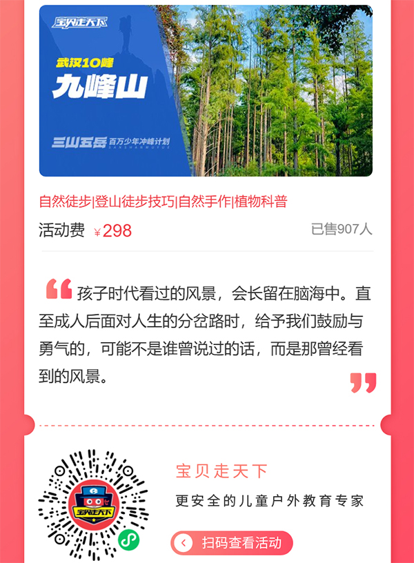 宝贝走天下,国内首家通过ISO9001“国内儿童研学旅行”认证的儿童户外活动机构,截至今日已覆盖全国20+城市。专注打造高品质儿童户外活动,践行儿童户外成长教育。目前公司已发展成国内儿童户外教育标志性企业。获得包括著名天使投资人王刚、暾澜资本、上市公司皇氏集团、华盖资本、丰厚资本等机构从天使轮到B轮的融资。公司核心团队成员多来自阿里巴巴、中国美院、新东方等互联网企业与教育机构,汇聚资深户外活动玩家与儿童教育专家。公司总部在杭州,下设北京、上海、广州、深圳、南京、济南、西安、成都、厦门、福州、武汉、长沙、苏州、宁波等20+城市分部。