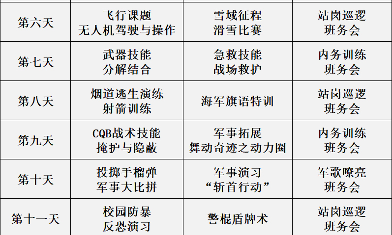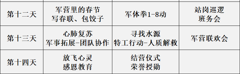 (5)冬令营活动采用全封闭军事化管理,营员统一食宿,活动期间不安排家长探视;