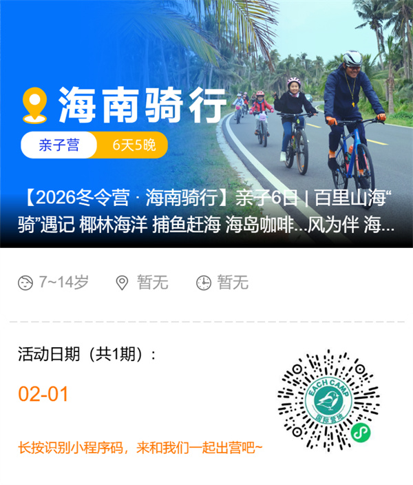 「海南骑行」2026百里山海“骑”遇记亲子冬令营(6天)椰林海洋 捕鱼赶海 海岛咖啡...风为伴 海为路