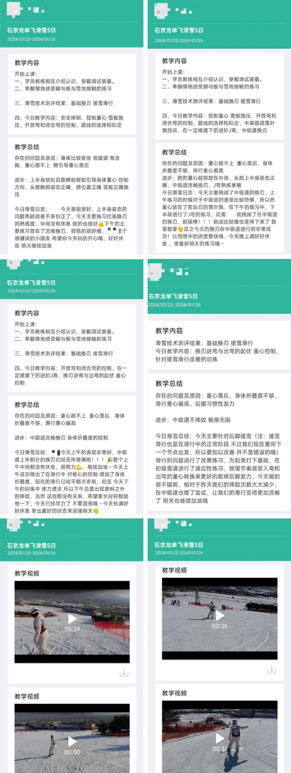 教练会根据每位营员的表现和进步提供反馈和建议,通过滑雪日志记录营员的每一次训练和进步,清晰地看到学习过程中的成长轨迹,也为家长提供一个了解孩子滑雪情况的窗口。我们也鼓励学员通过教练的点评进行自我总结,从而更主动地参与到滑雪课程中。