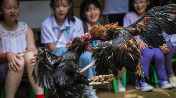 斗鸡比赛作为中国一项历史悠久的民俗游戏,在傣族村寨十分盛行。性情凶猛的雄性斗鸡具有很强的领地意识及竞争意识,它们目光如炬、喙强有力、翅疾爪健,是真正的“战斗鸡”。