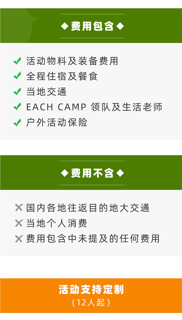 A:全程没有高危户外活动项目,雨林徒步、心之所“象”等项目都有专业人事带领前往与进行活动开展。Ps:户外运动存在一定的意外风险如磕伤擦伤等情况,每个宝贝我们都上有户外运动保险,由于意外产生的医药费均由保险承担,如介意请慎拍。