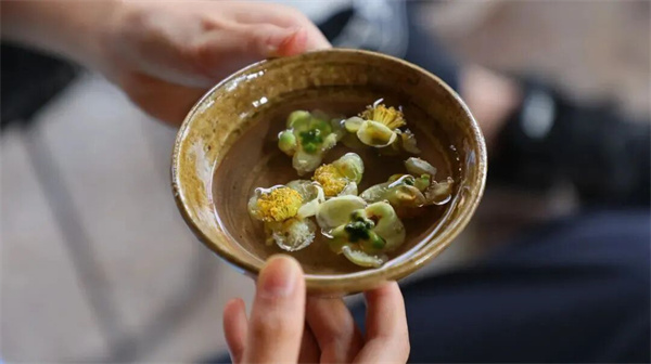 茶叶被轻轻地放入茶壶,温水慢慢地浸润,茶汤随着时间的推移,从深黄逐渐变成琥珀,散发着沁人心脾的香气。从来不知道从未经过任何处理的茶花泡水后也是这样沁人心肺的香,早上采摘下来的茶花只要经过粗略的筛捡就可以泡水喝了,这就是原汁原味的香气来源。