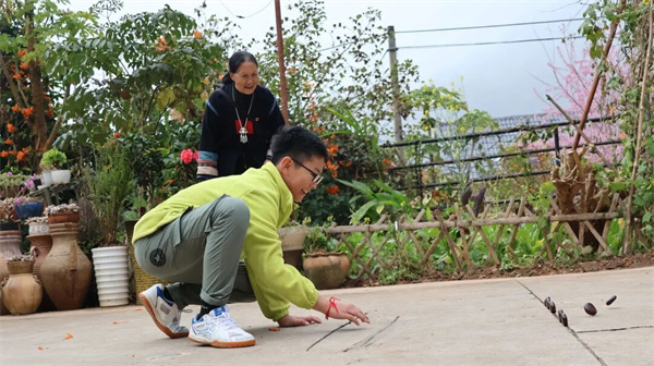 游戏开始,大家站在一定距离外,手持大大的种子,瞄准地上立着的种子,用力投掷出去。目标就是把立着的种子打倒,在这个过程中,要比拼谁的眼力好,谁投掷得又准又有力。