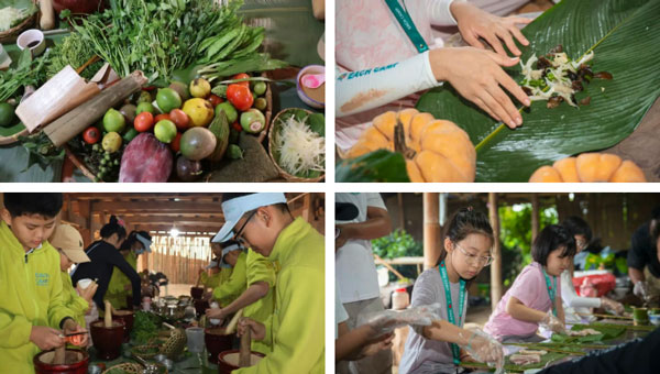 在当地的傣楼里,桌上摆满新鲜食材,大家将肉类、糯米、蔬菜等食材用各种香料腌制后,用芭蕉叶包裹严实,制成西双版纳传统美食。