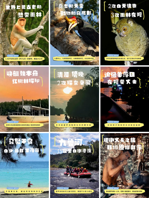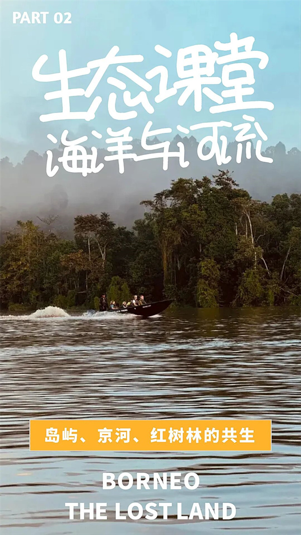 清晨的京河的雾气还未散去,各种鸟类已经开始活跃。犀鸟成群飞过头顶,翠鸟在枝头伺机捕食,白腹海雕在天空盘旋。下午如果运气好,还能看到婆罗洲特有的长鼻猴家族在河边树林中进食。