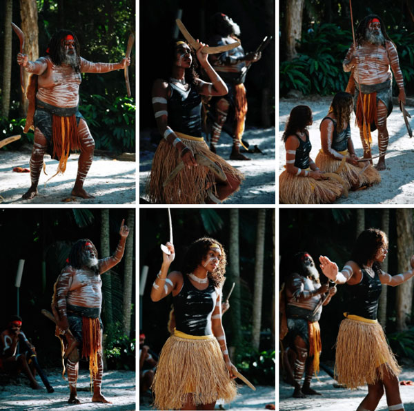 金海岸原住民Yugambeh語言群體的土著代言人路德,与他的家人,手持土著狩猎回旋镖,展示土著文化舞蹈音乐。