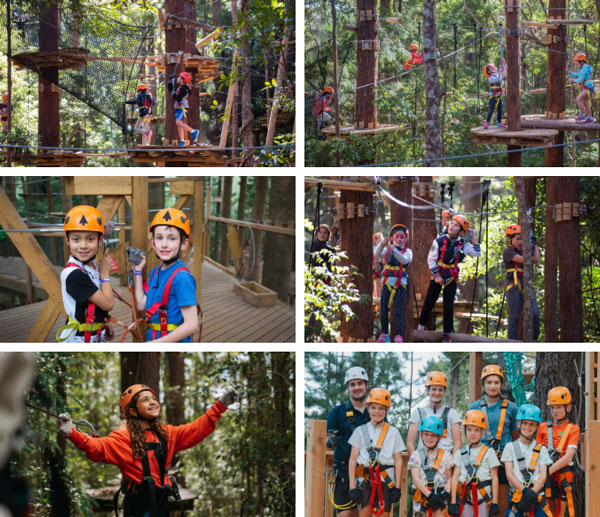 系上安全绳,在离地数米至十余米的树冠层之间,通过悬空桥梁、网道、滑索(Zip-line)、摇摆不定的木桩等各式关卡,从一个树平台移动到另一个。