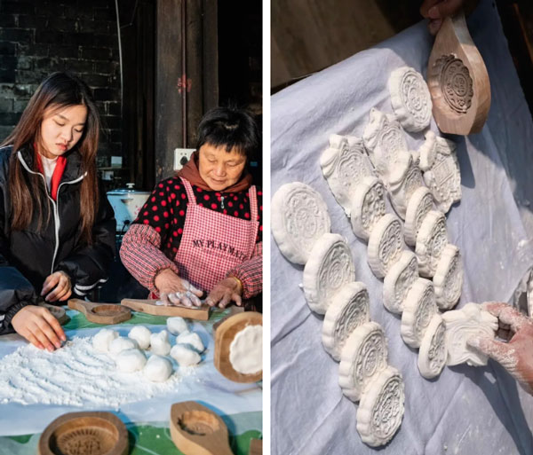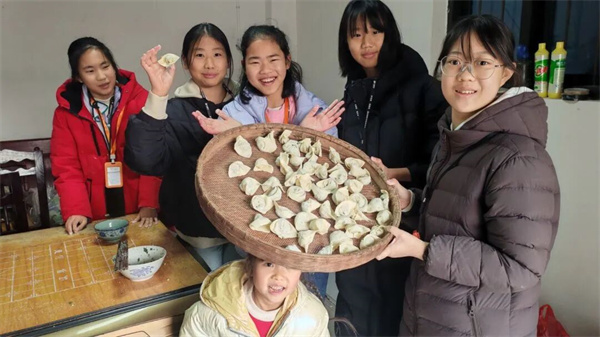 做客农户家 「快进屋,火桶煨好了,先吃茶!」主人家的热情招呼声从院落里传来。案板上,已备好年夜饭的重头戏——包袱饺的馅料。大家洗净手,和主人家一起包包袱饺。这是徽州人过年必吃的美食,因其形似古时商人外出所背的包袱而得名。表达着对新一年行囊丰满、衣食无忧的美好祈愿!