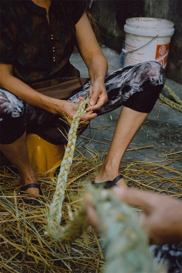 孩子们将一束束稻草捆扎在龙脊绳上。不一会儿,一条栩栩如生的草龙便初具雏形!干枯稻秆在指间翻飞成虬结龙身。举起这条金光闪闪的草龙,舞去旧岁晦气,舞来新年兴旺。