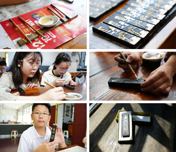 在百年老字号胡开文墨厂传人指导下,观看用骨胶与桐油烟调和万次,感受“墨陈如金石”的奥秘;孩子们将完成描金的特别体验:以24K金粉勾画龙凤纹样。
