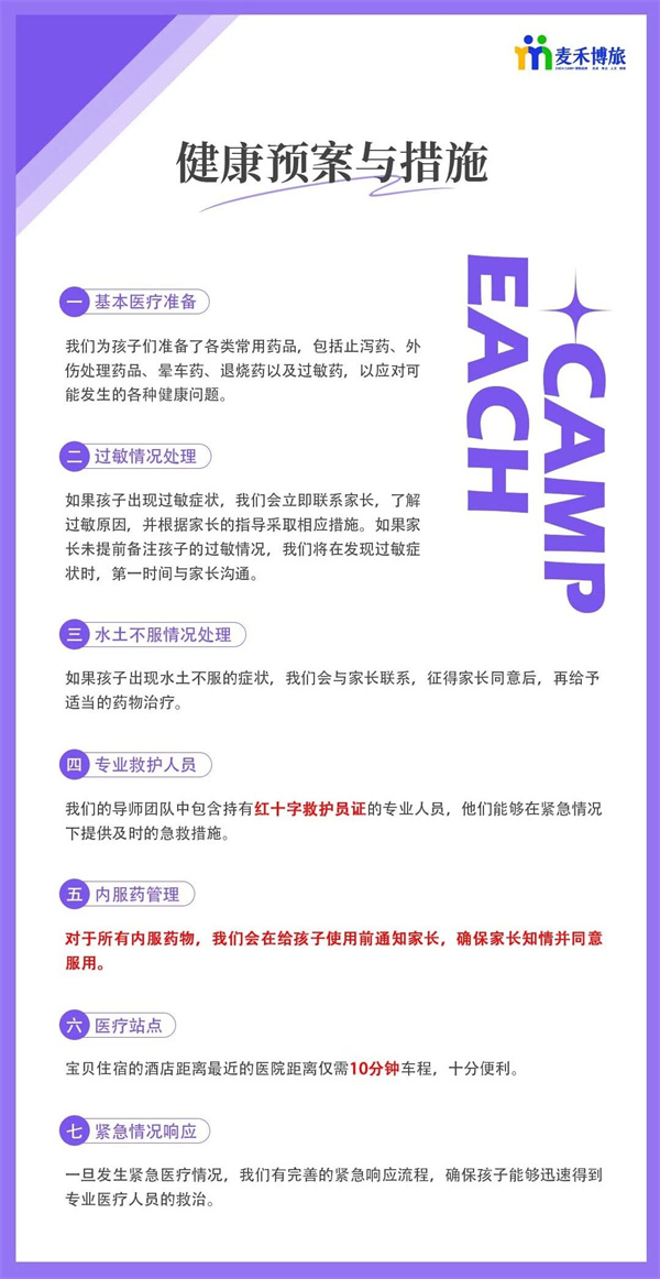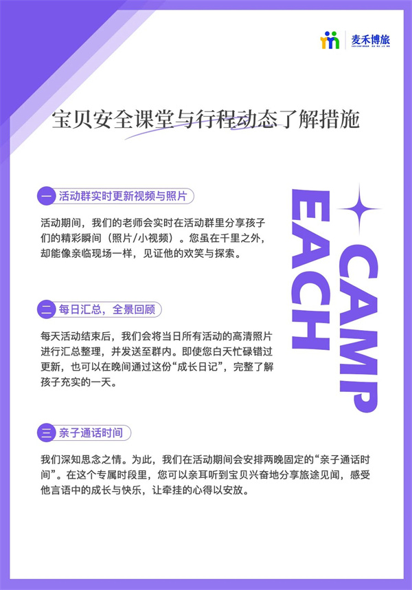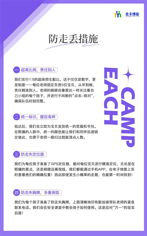 在此基础上,我们构建的是多重安全防线:防走丢措施、医疗保障措施、安全课堂与行程实时汇报!