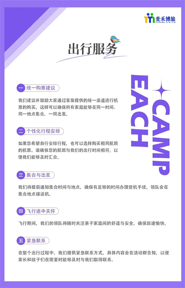 如您希望自行安排行程,请确保您的机票与我们的出行时间相符,以便我们能够及时为宝贝提供必要的协助,我们将为孩子们提供以下服务: