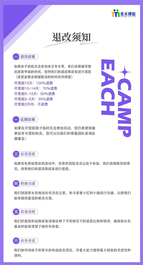 宁宁老师,你们行程设计得确实精彩,但一些实际的细节问题我还是很担心。比如万一去不了退费怎么办?吃住到底怎么样?他要是想家了你们怎么疏导?