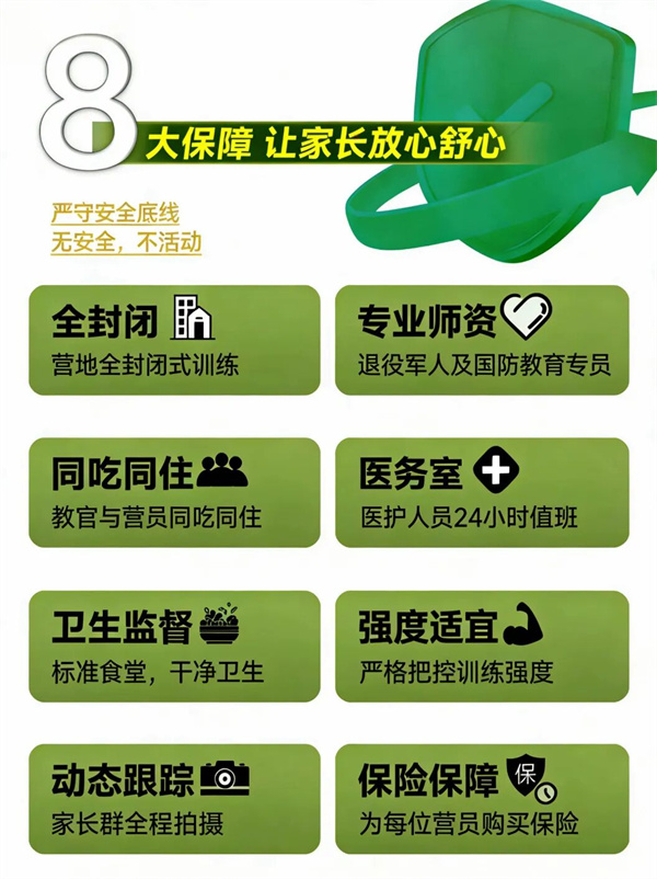 师资配备:25 人为一个班,每班配备一名主训教官、一名辅助教官,辅助教官 24 小时陪护。