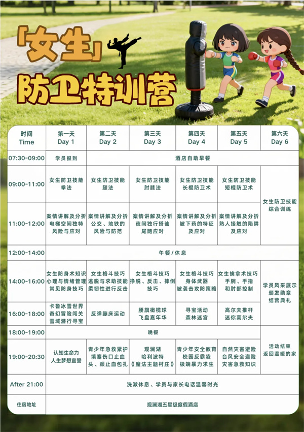 2、训练营实行全封闭管理,设营地负责人一名、女教官一名,女生活老师一名。