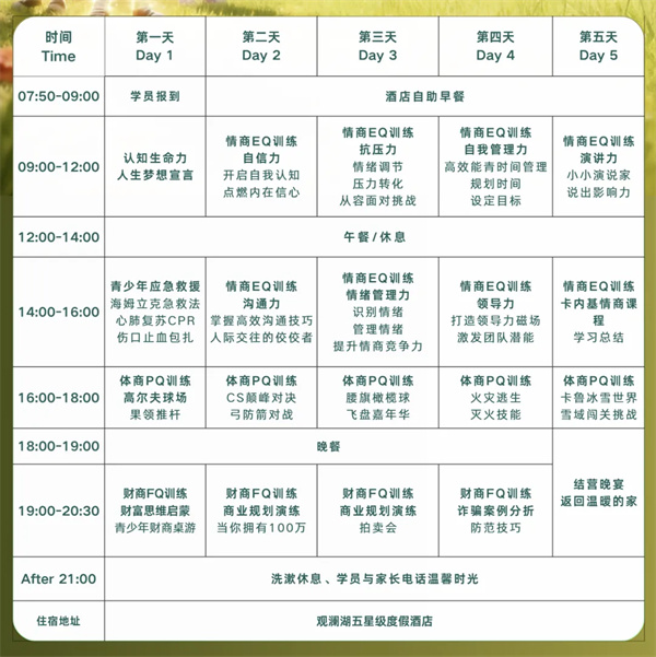 4、保险:训练营活动中我们将为每位营员购买二十万元意外伤害保险。