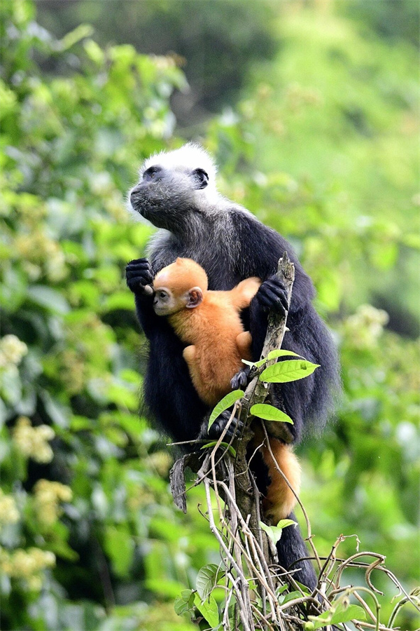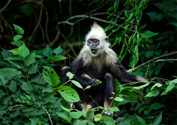 白头叶猴,被称为"石山精灵",是全球25种最濒危的灵长类动物之一,仅分布于广西西南部的喀斯特石山地区。它们头顶白色冠毛,身着黑色"外套",在峭壁间灵活跳跃的身影,宛如山间的舞者。