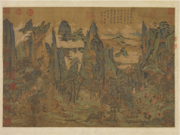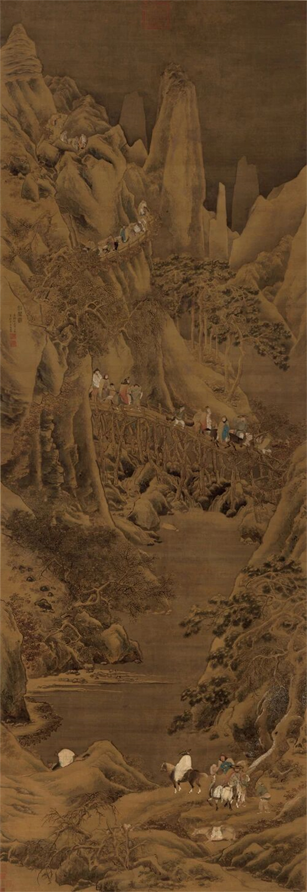 《明皇幸蜀图》描绘了唐玄宗避安史之乱沿蜀道入川的场景。蜀道此时成了“逃亡之路”,山川的险峻与车驾的渺小并置,让人看见盛世与流亡之间那一线之隔。