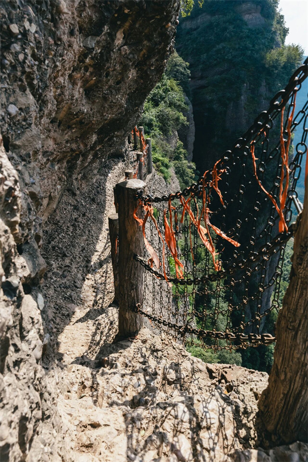 我们现在还能在岩壁上看到当时留下的凿孔,每个孔深约半尺,嵌入木梁后再用铁楔或石楔固定,使整条栈道既稳固又能随山势弯转。这种结构让木道能贴壁“悬空”延展数里,既避洪水冲击,又保持通行安全。