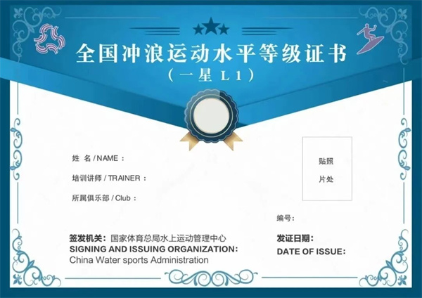 完成课程学习并通过冲浪等级考核后,可获得国家体育总局认证等级证书,这是国内最规范的认证体系。