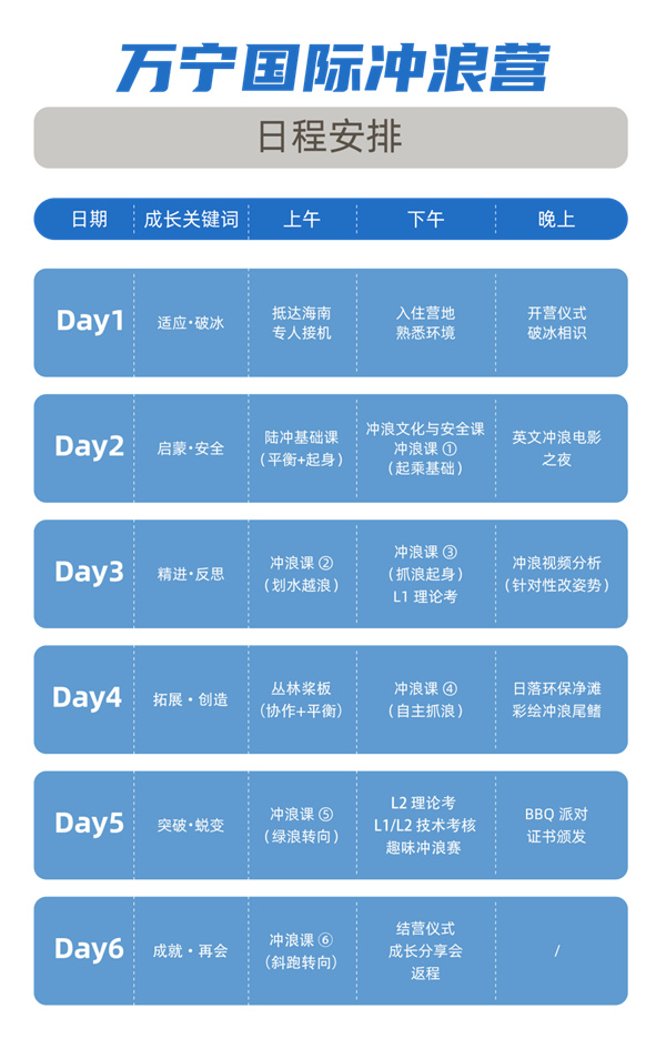 让我们一起抵达全球冲浪圣地——海南万宁,用6天5晚的时间,见证少年如何借海浪之力,唤醒内心的自信、坚毅与担当,真正开启属于自己的破浪之行!