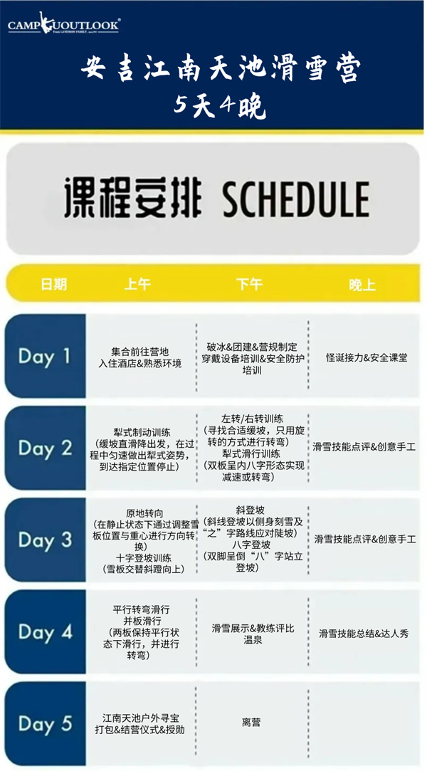 Step4:滑行能力升级挑战 “平行转弯滑行” 和 “并板滑行”,这可是滑雪进阶的关键标志!上午专注训练,下午举办 “滑雪展示 + 教练评比”,让娃在终极展示中收获自信!