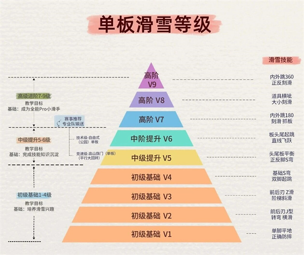单板1-4级和双板1-5级为初级基础教学阶段,本阶段为滑雪学习基础阶段,以培养兴趣、良好滑雪习惯和标准滑雪动作为主。