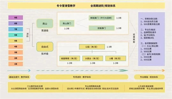 课程体系参考大众滑雪等级和加拿大教学体系双体系优势,形成3阶9级滑雪基础教学体系及专项进阶体系,为营员定制适合的教学方案,更专业,更有针对性!