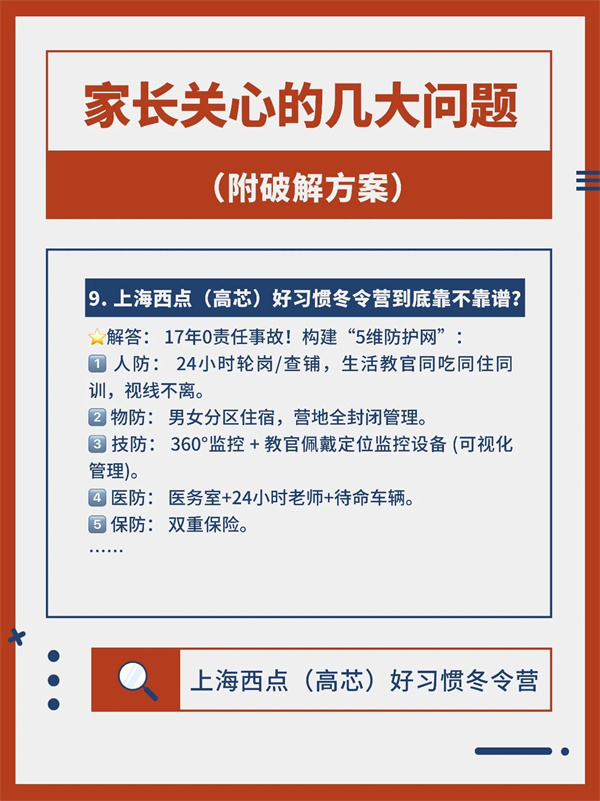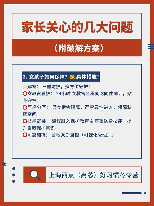 解答:三重防护!女教官全程陪伴、男女分区住宿、防身技能课程+360°监控,多方位守护。