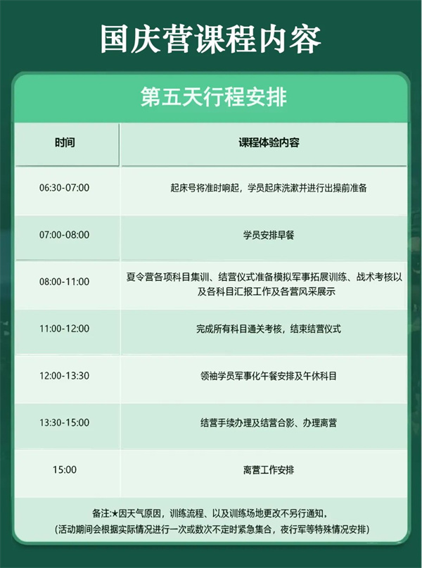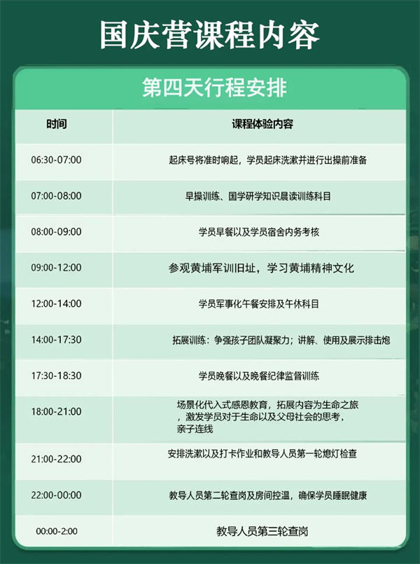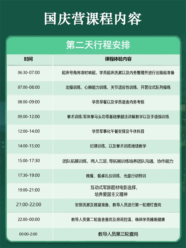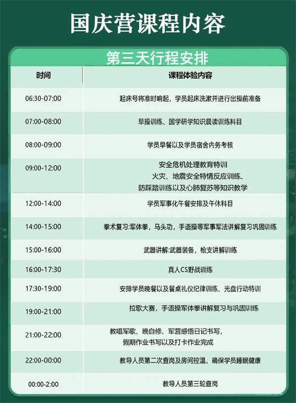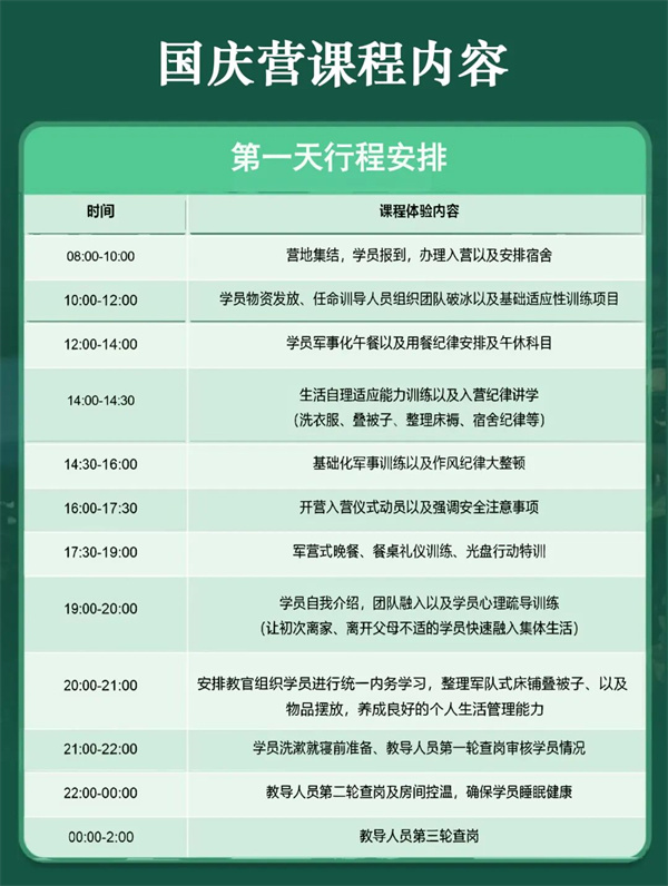 全程军事化管理,严格作息时间,参考部队先进的训练计划,制定出符合当下青少年身心健康成长的科学作息时间,规范营员的行为习惯及训练营员的生活技能,为后续行为习惯养成打下坚实基础。