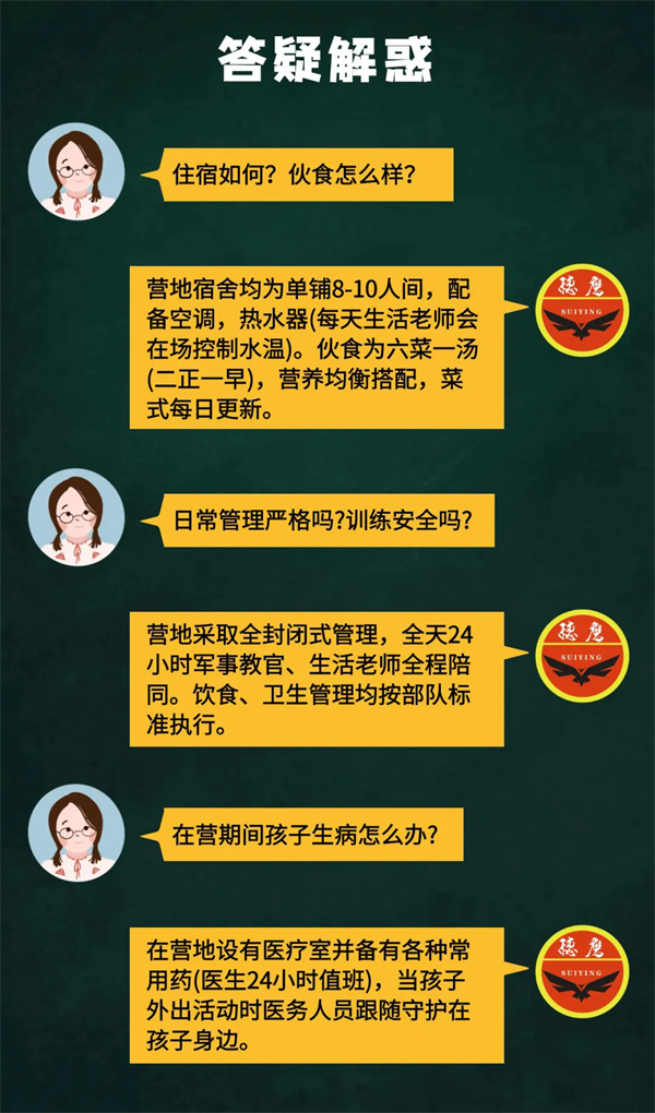 住宿安排:标准的6-8人间,配有:空调,热水器,独立洗浴间,床铺,枕头,被子,保证小战士入营有充足的物资保障。