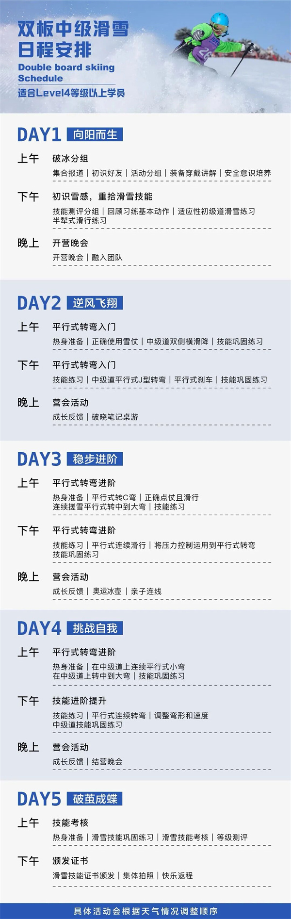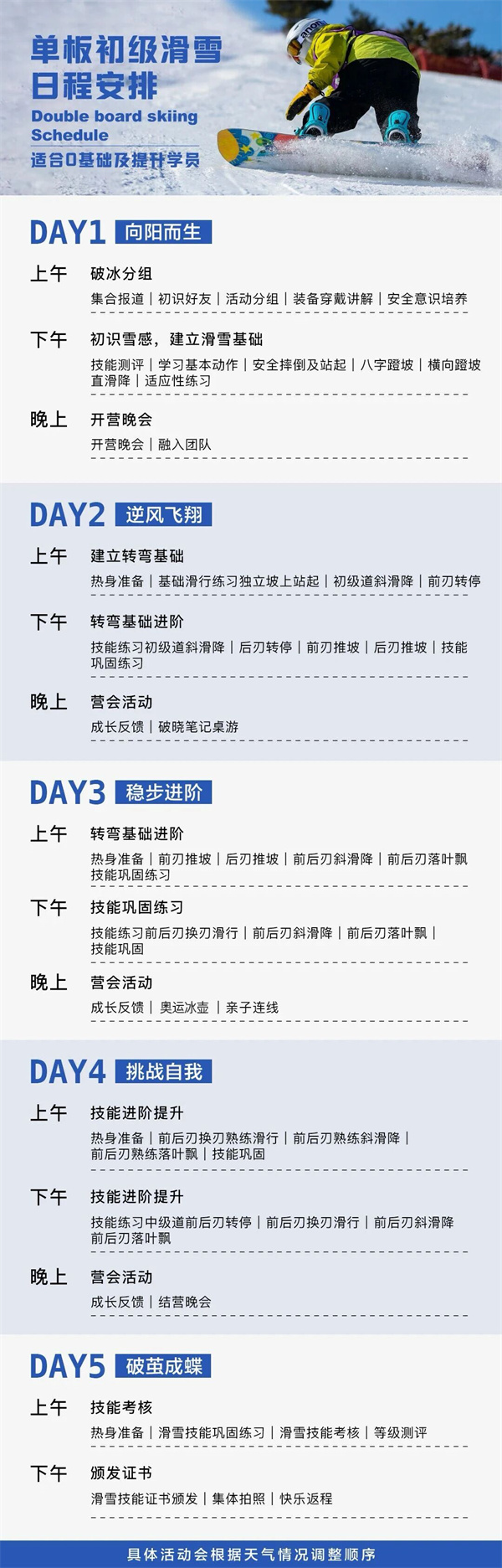 8.单板学员【务必】自行准备:护臀护膝护肘护腕。