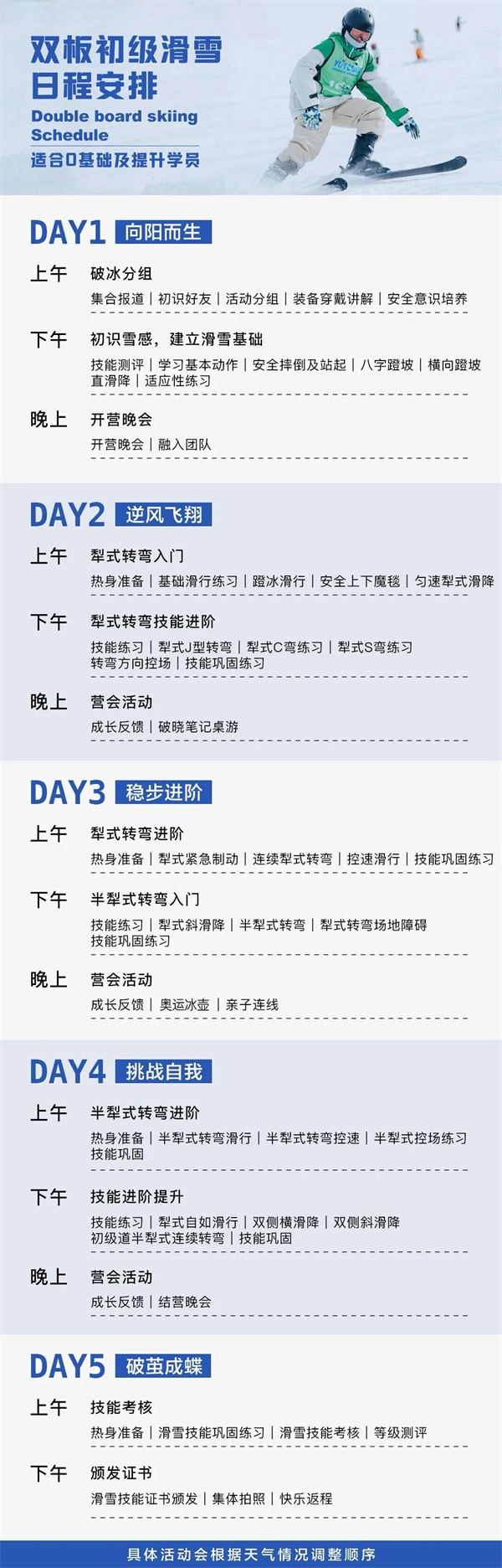 滑雪冬令营课程从孩子的兴趣爱好出发,分设双板和单板两种滑雪课程。由专业团队遵循UYoung儿童滑雪教学体系,细分等级,设计出适宜的课程安排。
