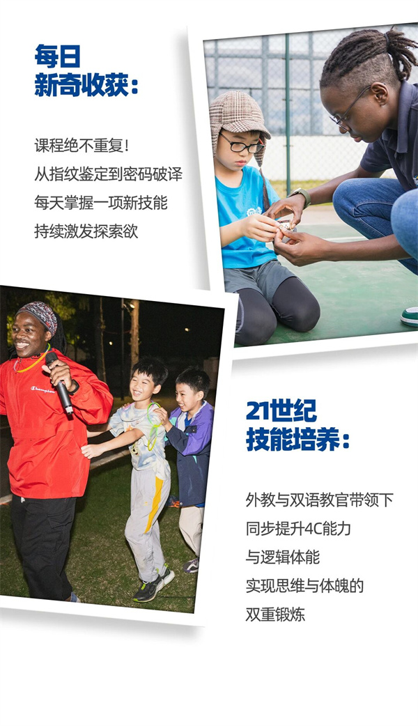 在侦探营中,结合各种丰富多样的侦探主题活动,在全新的环境中给孩子们“创造问题”,在解决过程中培养他们的21世纪技能,帮助孩子们在未来的生活和职场中能够应对和克服遇到的各种挑战。