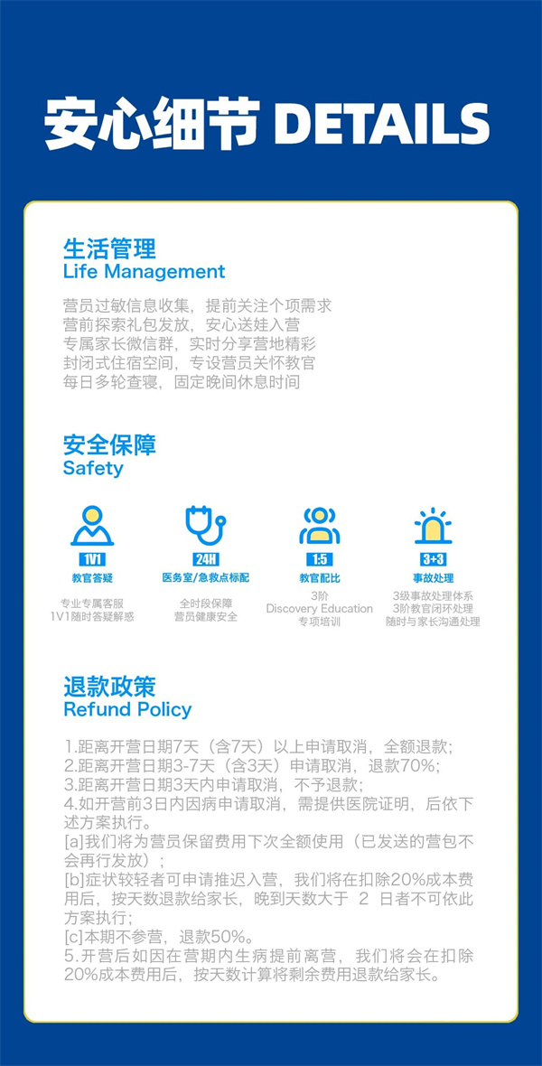 5、开营后如因在营期内生病提前离营,我们将会在扣除20%成本费用后,按天数计算将剩余费用退款给家长。