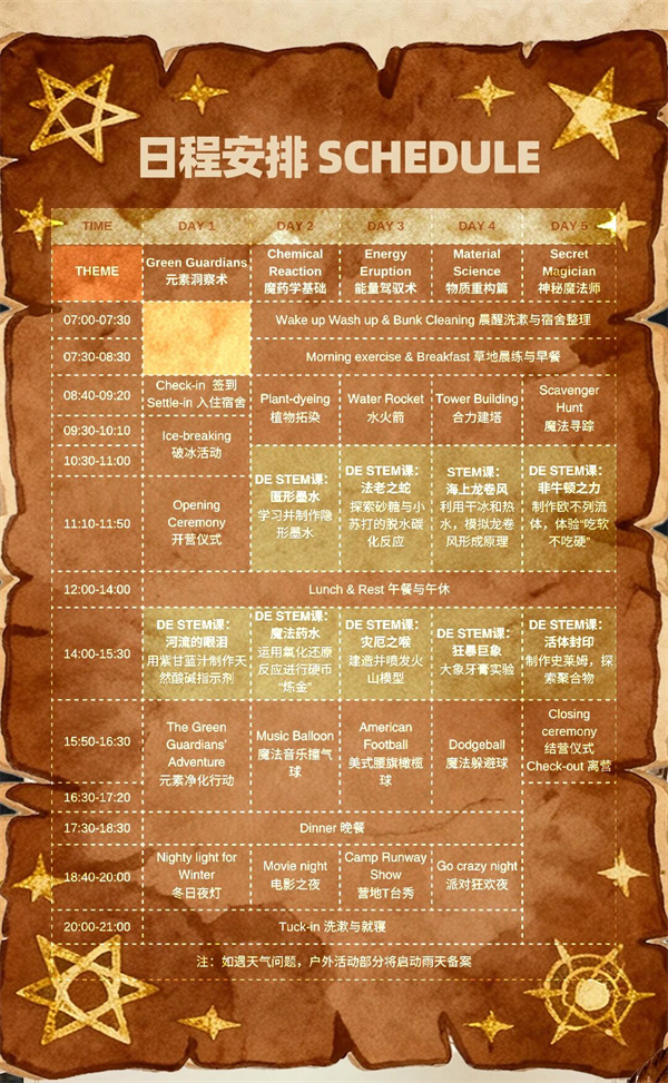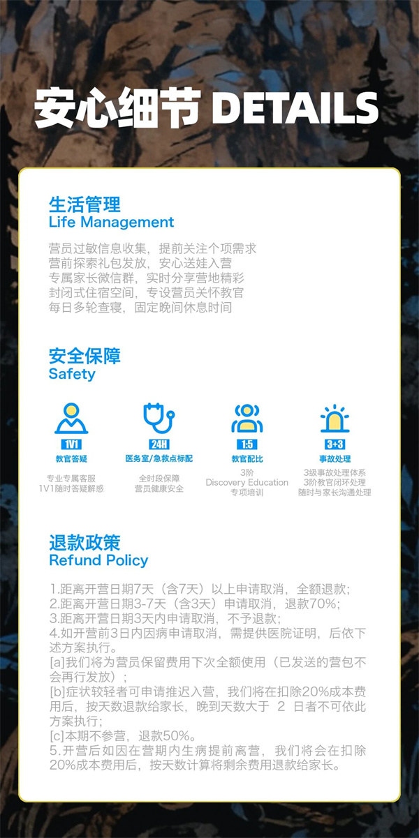 5.开营后如因在营期内生病提前离营,我们将会在扣除20%成本费用后,按天数计算将剩余费用退款给家长