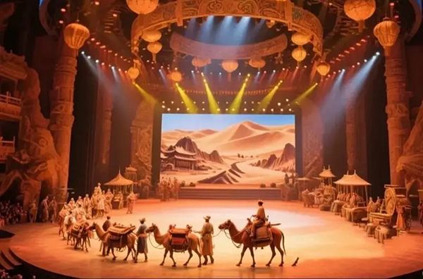 以盛唐丝路文明为魂,汇驼队、狼群、瀑布、佛光等西北元素,突破时空维度,再现千年商队穿越秦岭、横跨大漠的壮阔征程。让观众在苍狼长啸与驼铃声中,重走丝路万里征程。驼铃声响彻耳畔,丝绸之路的千年故事在360度旋转舞台上鲜活重生,东西文明在此完成一场跨越时空的对话