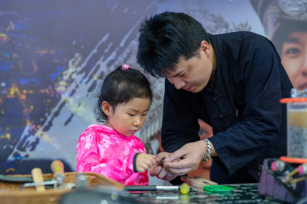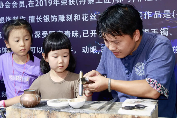在丹寨非遗工坊,与非遗大师共同执起錾刻工具