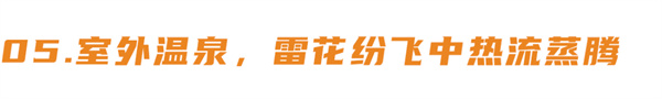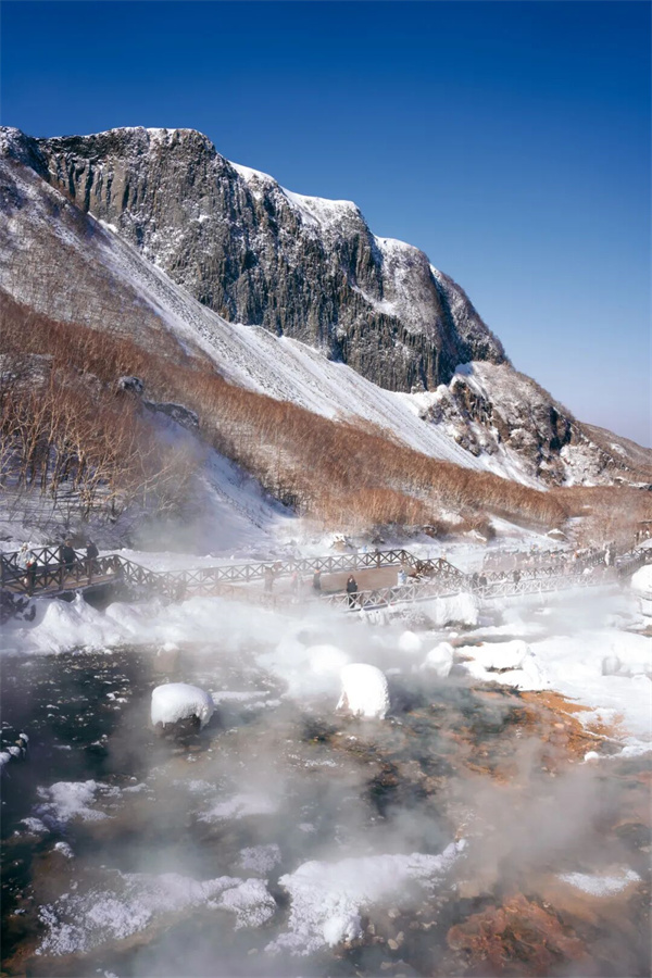 长白上的冷与温泉水的热,有着极致的对比。来了长白山,怎能不体验一次温泉呢?我们将在室外零下 30 ℃的温度下,雾气缭绕的极地温泉里,一边欣赏着美丽的雾凇雪景,一边享受着40℃的温泉,感受"冰与火的洗礼"。躺在暖流中,发丝的冰晶与山顶的雾凇相映成趣,简直是神仙般的享受。