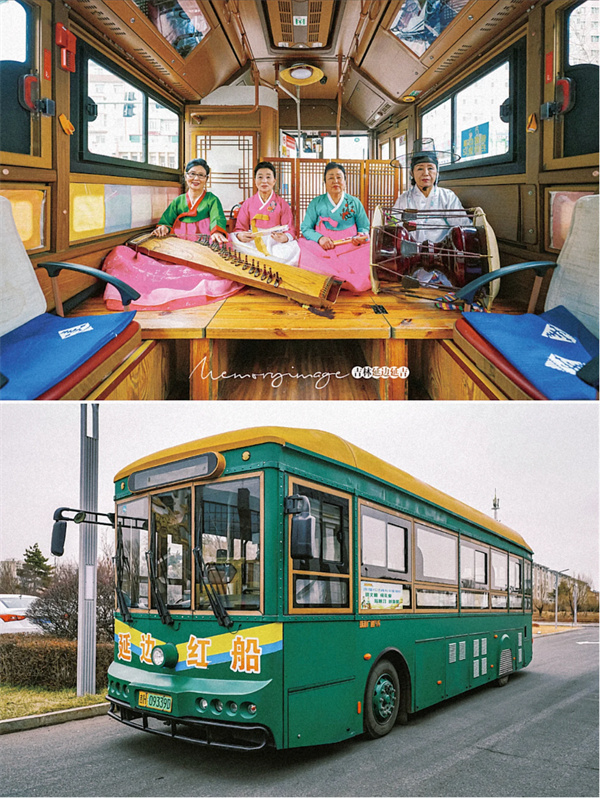 铛铛车内部充满了复古韵味,遗留下来的是时光的痕迹。铛铛车可不是只坐这么简单,中国朝鲜族非遗传承人会轮番为大家演奏各种器乐,表演经典的朝鲜族歌曲。行驶在延吉的街道上,耳边环绕着经典乐曲,车窗外是延吉的城市风貌,我们用视觉和听觉一同感受着这座城市的独特韵味。