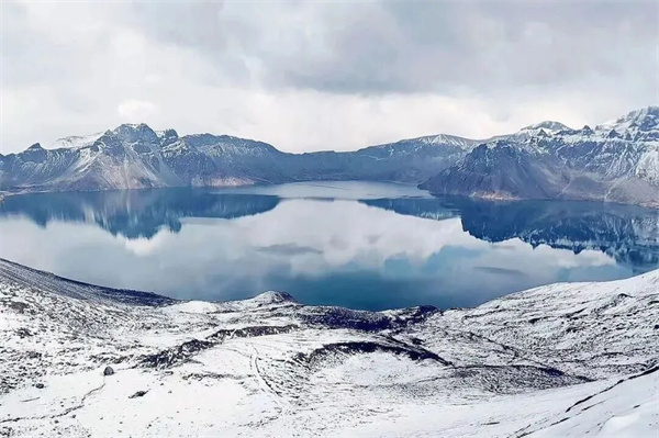 来长白山,一定要去天池看一看。天池的水,平稳的让人怀疑是不是时间静止了,周围的纯白将天池的水映衬的格外湛蓝,宛如玉盘翠珠。