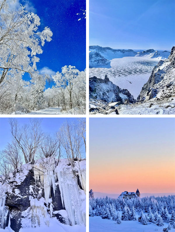 绵延的山脉,森森的古木,蓬松柔软的雪地,蓝色宝石的天池,气势恢宏冰瀑群,置身其中,仿佛身处艾莎的冰雪王国。
