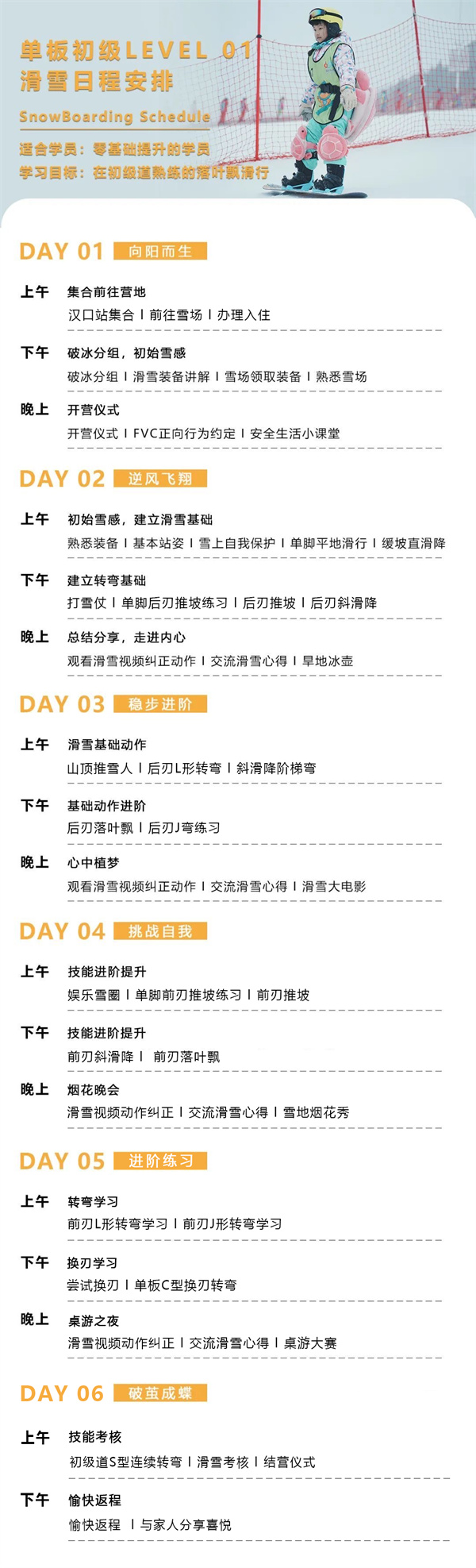 滑雪冬令营课程从孩子的兴趣爱好出发,分设双板和单板两种滑雪课程。由专业团队遵循探知乐途儿童青少年滑雪教学体系,细分等级,设计出适宜的课程安排。